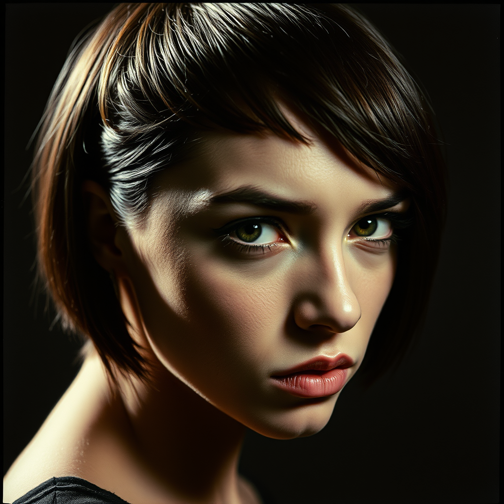 A dramatic portrait of a young woman with an edgy bob haircut and intense eyes. The image is captured in a bold, high-contrast manner, with deep shadows and bright highlights that accentuate her angular features. Shot with a vintage film camera and a fast prime lens, the photograph exudes a gritty, raw atmosphere. This striking portrait is ideal for fashion magazines, advertising campaigns, or as captivating wall art.