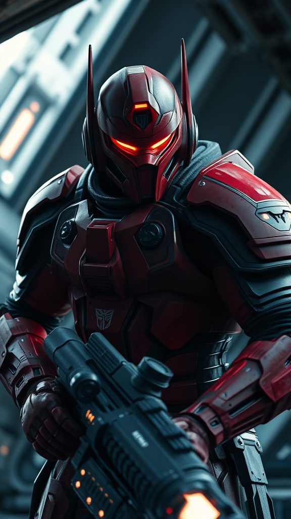 A dramatic ultra-wide photo captures a rugged warrior adorned in red sci-fi armor with a sleek cyber helmet, illuminated by glowing lights on the cyber mask. The full armor design exudes strength, featuring meticulously detailed insulated plating akin to Optimus Prime. The warrior strikes an aggressive, dynamic pose, clutching a formidable weapon, reflecting both power and intensity. The bald head adds a fierce edge, complementing the moody, cinematic sci-fi ambiance. Set against the backdrop of a spaceship, the scene is bathed in natural light, showcasing photorealism with cinematic rendering and advanced ray tracing. The image, shot in third-person view with a skillful blur effect and long exposure, is presented in stunning 8K Ultra-HD, characterized by moody cinematic lighting that enhances the dramatic atmosphere and highlights every intricate detail.