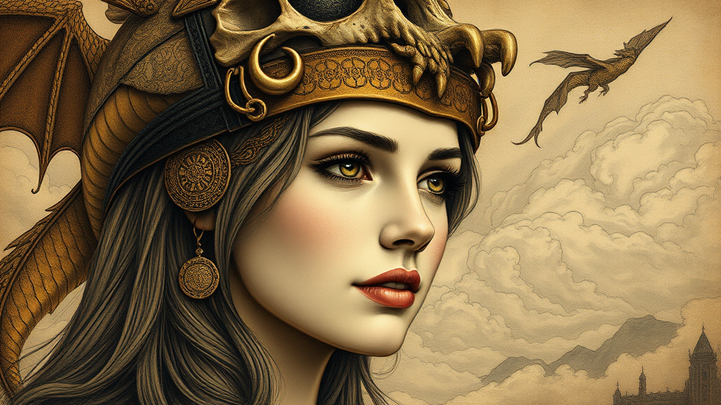 A drawing of a woman adorned with a skull helmet, in the style of Pinturicchio, with elements of dragon art and intricate detailing. The large-scale portrait is infused with light bronze and bronze hues, featuring elaborate engraved line-work reminiscent of Jessie Arms Botke. The background portrays a mystical landscape, incorporating swirling clouds and faint silhouettes of dragons, enhancing the ethereal quality of the composition while maintaining the core essence of the original concept.