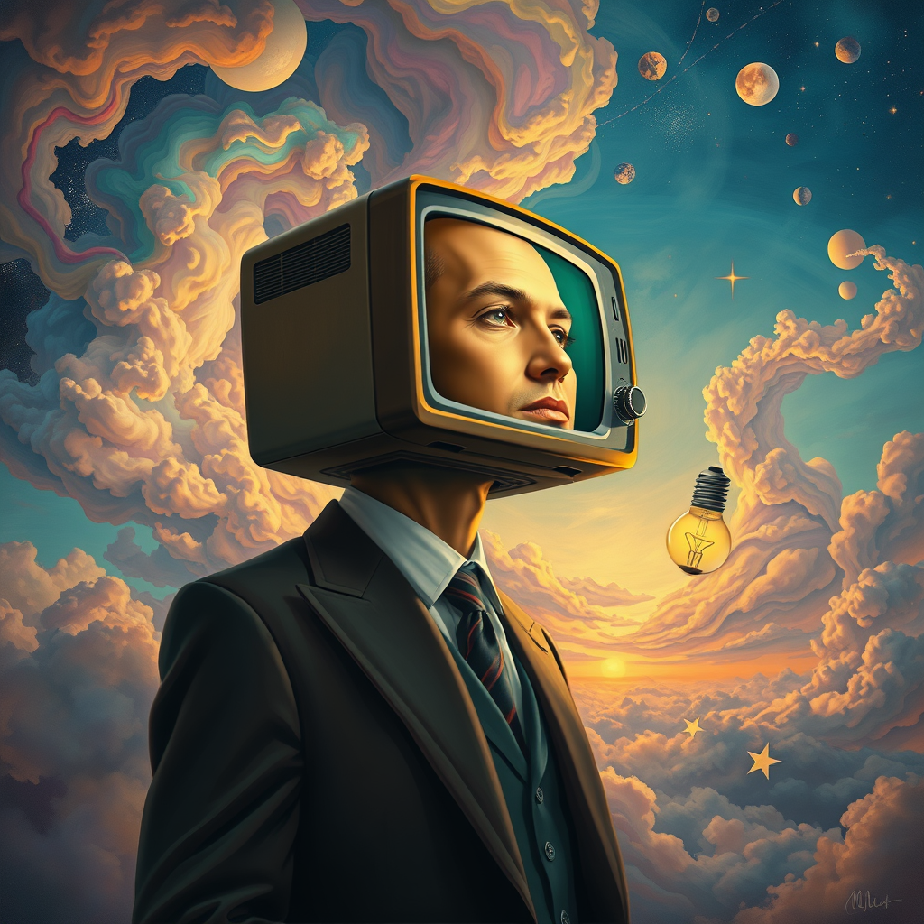 A dream-like painting of a man in a vintage suit with a retro television for a head, the glowing screen displaying his contemplative face, surrounded by swirling clouds of vibrant colors, and floating geometric shapes that twist and turn in an endless sky, a single glowing lightbulb floating by his side, illuminating abstract symbols and hints of distant galaxies in the background.