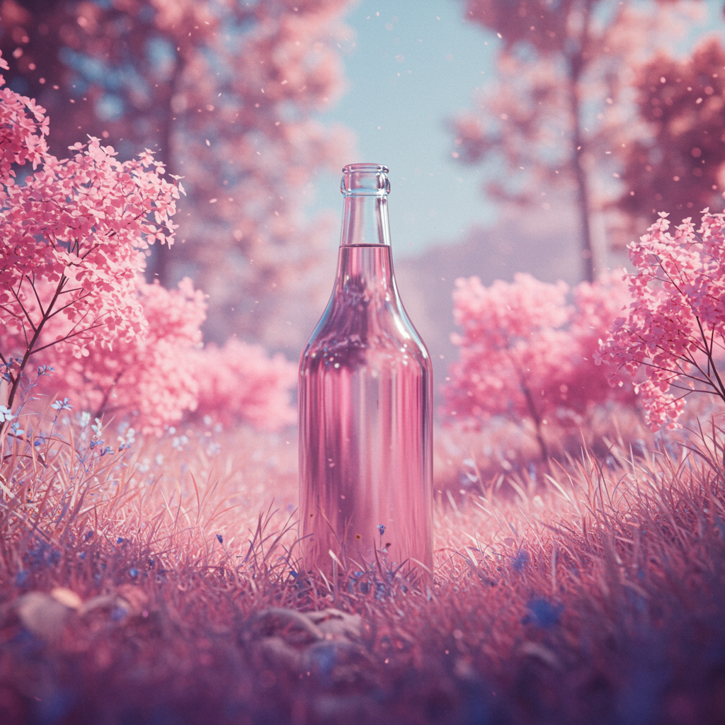 A dreamlike and colorful nature scene captured with a Nikon D850, featuring a full bottle nestled in lush pastels, invoking the hyper-detailed photorealism style of Greg Rutkowski. Utilizing an f/1.6 lens for lifelike sharp focus and high resolution, the image showcases intricate details and atmospheric light refraction, rendered in Unreal Engine 5 for a cinematic concept. This photography masterpiece is brought to life with Octane rendering, trending at CGSociety, and entices with its vibrant art and striking contrast.