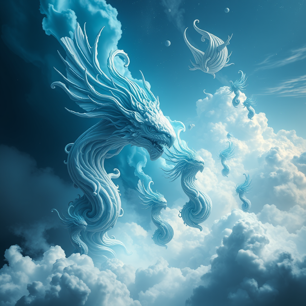 A dreamlike depiction of a celestial realm amidst the clouds, inspired by Tanya Shatseva and The Stars Art Group, with hints of Meghan Howland's influence. Dominated by hues of dark indigo and light cyan, the scene features surreal and mind-bending sculptures, crafted with hyper-realistic detail yet exuding fluid simplicity. The ethereal atmosphere is enhanced with a sense of wonder and tranquility, as the intricate designs seem to float effortlessly, creating a mesmerizing landscape.