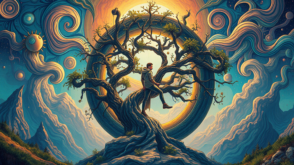 A dreamlike depiction of a massive ring featuring a person hovering above an ancient tree, set against a backdrop of vibrant fantasy landscapes. The scene is filled with psychedelic swirls and surreal, melting forms in rich hues of teal and bronze. The illustration exudes energy, blending hikecore elements with sublime wilderness vibes, capturing the essence of breathtaking poster art that leaves one in awe of its beauty.