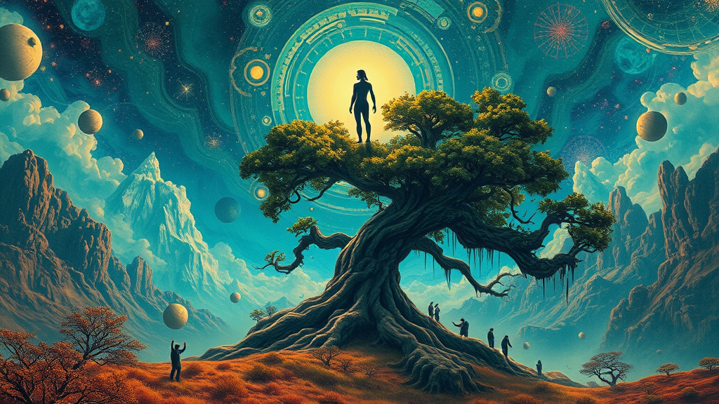A dreamlike depiction of an enormous human silhouette hovering above a majestic tree, set within a fantastical landscape. The scene bursts with vibrant colors and psychedelic patterns, where teal and bronze hues dominate, creating an ethereal, energy-infused atmosphere. The terrain evokes a sense of surreal wilderness, with elements that appear to melt and warp in a sublime dance. This visual spectacle, rendered in the style of intricate poster art and hikecore, is overwhelmingly beautiful and almost otherworldly.