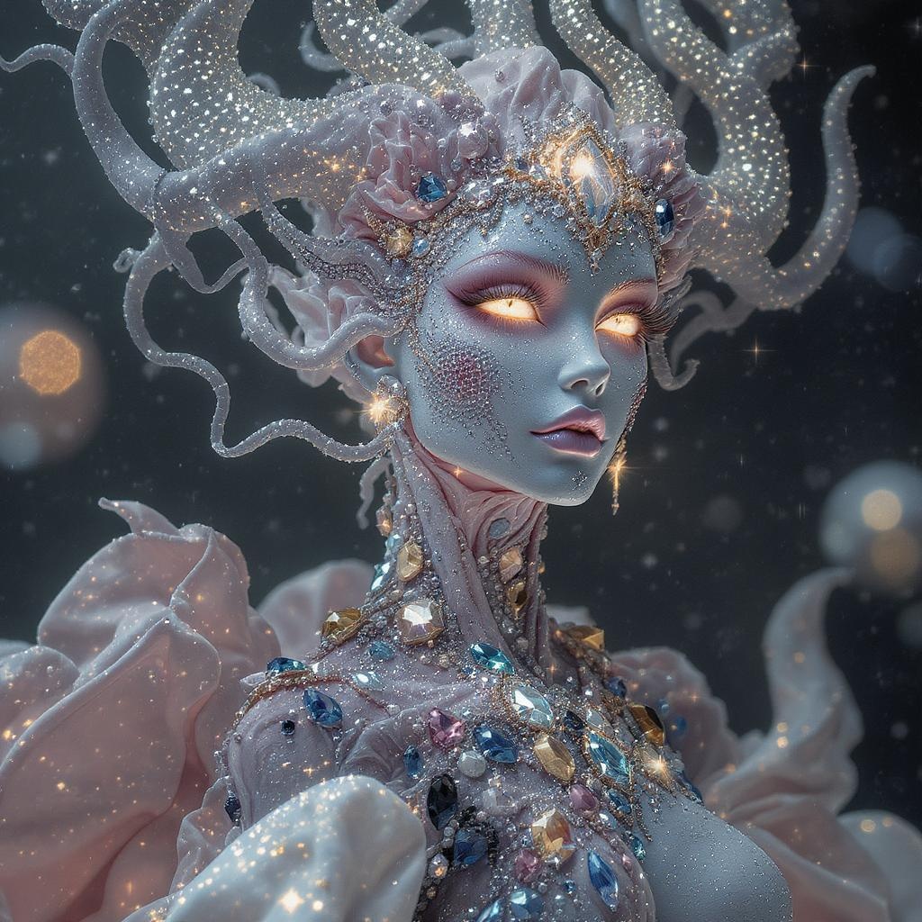 A dreamlike human chimera adorned with a biomorphic aesthetic, enveloped in Swarovski crystals and exquisite gems, capturing the trending essence of ArtStation creations. Inspired by the styles of Miho Hirano, James Jean, Roberto Ferri, Marco Mazzoni, and Karol Bak, the artwork embodies extreme detail and luxury. Set against a backdrop of cinematic lighting with sparkling glitter and delicate bokeh, the composition is centered and carefully framed with increased distance to the canvas edges. Utilizing the capabilities of Unreal Engine, the piece presents an immersive depth of field – no extraneous elements, just the mesmerizing presence of a singular, enchanting figure.