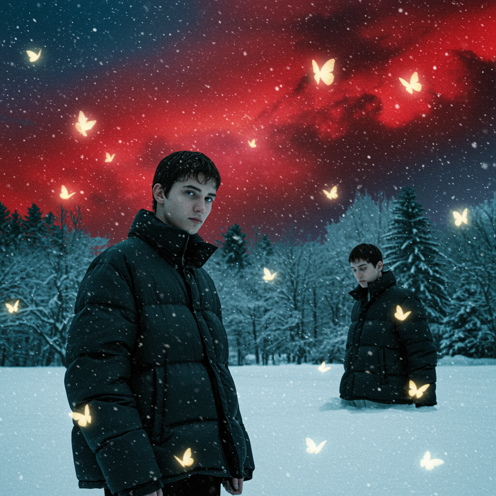 A dreamlike image depicting a snowy winter night, featuring fashion-forward puffer jackets under a surreal sky infused with dynamic shades of red and blue. The scene is enhanced by realistic, softly glowing butterflies flitting in a shadowy forest. The style embodies minimalist elegance with an androgynous allure, emphasizing a subtle black and frost-inspired color palette. The setting exudes a cosmopolitan and serene aura with expressive, tranquil faces. The composition is loose, fluid, and imbued with ethereal abstractions and a touch of chaos, creating a captivating and whimsical atmosphere.