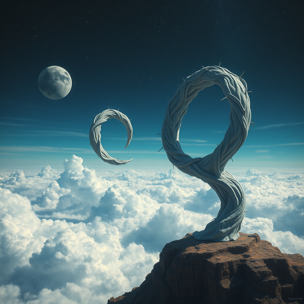 A dreamlike landscape in a world above the clouds, inspired by the styles of Tanya Shatseva and The Stars art group, blended with hints of Meghan Howland's influence. Dark indigo skies meet light cyan hues, creating a surreal atmosphere. Mind-bending sculptures twist and turn in realistic hyper-detail, evoking fluid simplicity. The scene is rich in texture and depth, capturing the imagination with ethereal beauty and otherworldly charm.