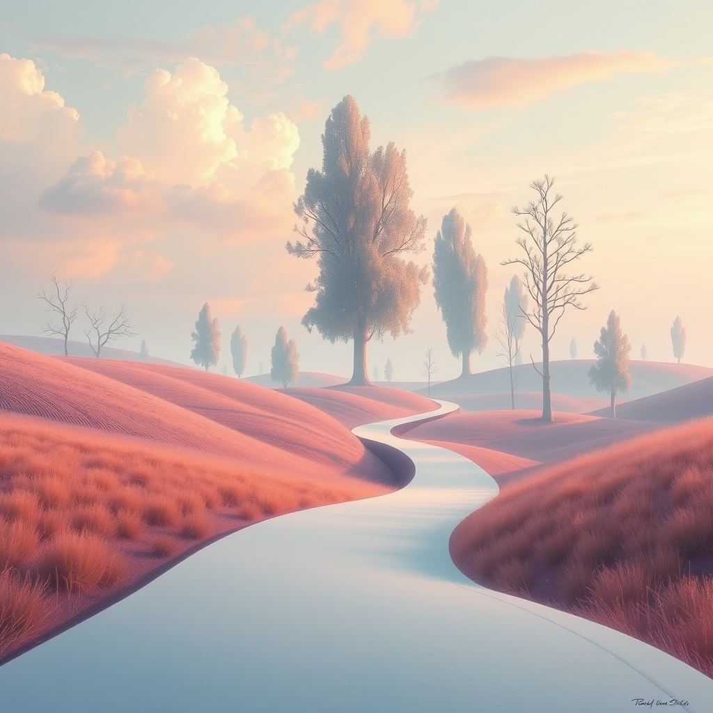 A dreamlike landscape with elongated pathways leading to towering, abstract trees; soft, flowing shapes blend sky and ground in a harmony of pastel hues, while distant clocks melt gently over undulating hills, capturing a serene yet enigmatic reality; softly lit by an ethereal glow, diffusing shadows that dance with quiet elegance.