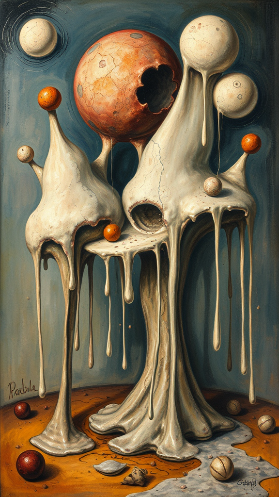 A dreamlike painting by Pablo Picasso featuring surreal and unusual imagery, with forms that appear to be dripping and melting, evoking a sense of distorted reality and fluid abstraction.