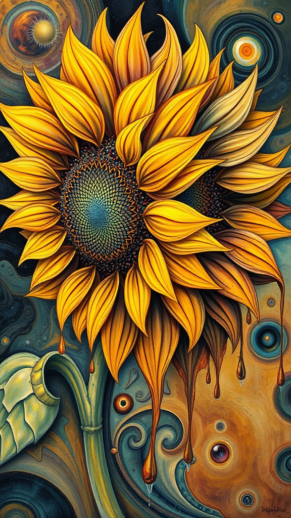 A dreamlike painting of a sunflower with surreal patterns, petals dripping and melting in a fluid cascade reminiscent of Salvador Dali's style, with hints of fractured dimensions and abstract forms echoing Pablo Picasso's influence, vibrant colors swirling in surreal harmony, elongated and distorted features creating a fluid dance, set against an elongated backdrop, transporting viewers into a whimsical, otherworldly realm.