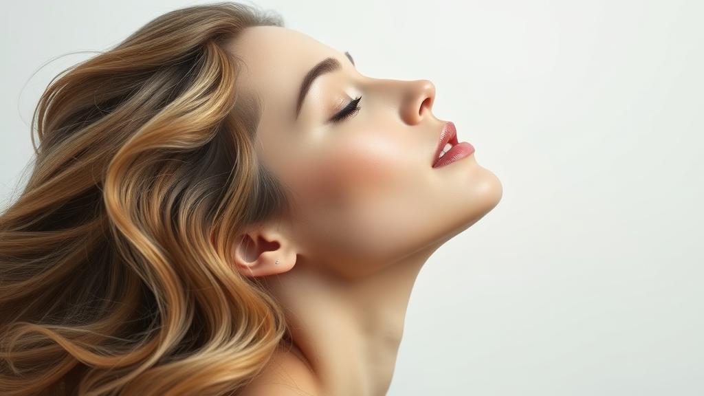 A dreamlike portrait of a woman, her head gracefully arched backward against a pristine white backdrop, her hair cascading in exaggerated, fluid waves. Her features, boldly accentuated with sinuous lines, possess an ethereal glow across her skin. A palette of soft pastel hues envelops the scene, crafting a tranquil and otherworldly ambiance. The photorealistic rendering in 4K UHD showcases intricate detailing, capturing a vivid essence of surrealism and serenity.