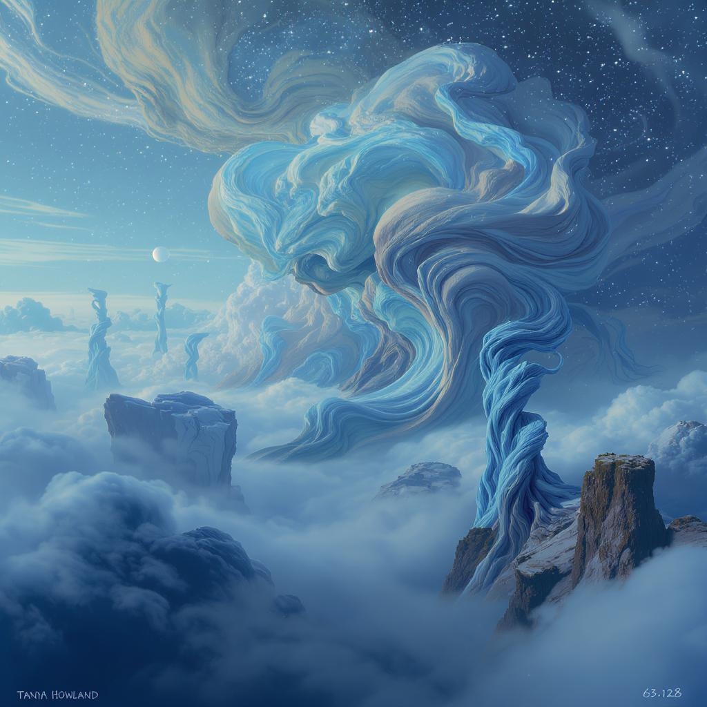 A dreamlike scene depicting a world in the clouds, inspired by Tanya Shatseva and the Stars Art Group, blending the styles of Meghan Howland. The color palette features dark indigo and light cyan, creating a surreal atmosphere. Mind-bending sculptures rise through the mists, showcasing realistic hyper-detail and fluid simplicity. The landscape stretches with an elongated aspect ratio of 63:128, and a unique stylization brings this ethereal realm to life.