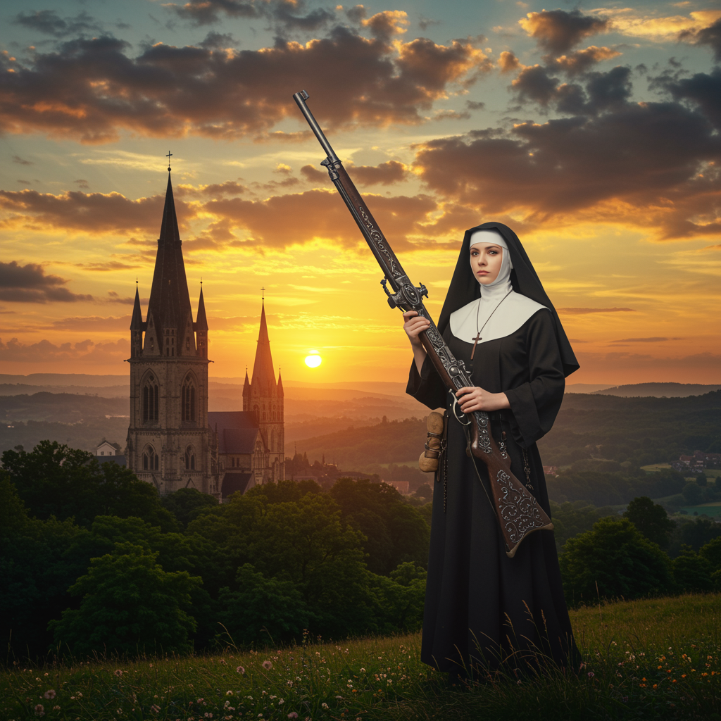 A dreamlike scene of an ethereal nun poised confidently with a large ornate rifle, her serene expression contrasting the power she holds. Behind her, a grand cathedral tower rises amidst a vibrant sunset sky, casting golden hues over the lush, rolling hills. The atmosphere, infused with surrealist elements, blurs the line between fantasy and reality, reminiscent of Die Brücke's bold expressionism. Majestic clouds swirl around the steeples, creating an otherworldly backdrop that elevates the entire composition into a realm of mystical wonder.