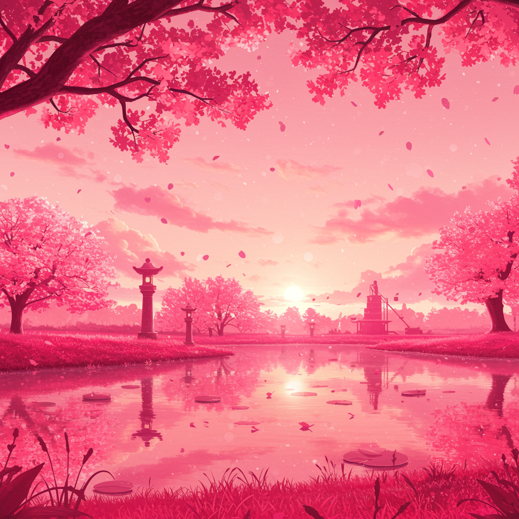 A dreamlike vision unfolds in a serene landscape bathed in soft pink hues. The entire scene resonates with perfect pink shading, enveloped in ethereal pink atmospheric lighting that creates an ambiance of tranquility and wonder. Inspired by the captivating styles of Makoto Shinkai, Stanley Artgerm Lau, WLOP, and Ross Draws, this vista depicts a surreal world where every element—from the gently swaying cherry blossoms to the reflections on a shimmering pink lake—plays a harmonious symphony of pinks. The sky transitions from pale rose to rich magenta as a warm, diffused light bathes the landscape, adding depth and warmth. Delicate clouds float across the sky, tinged with lavender undertones, enhancing the dreamlike quality. In this landscape, details are exquisite yet subtle, with each stroke and shadow contributing to the overall harmony, while imaginative elements like gently glowing orbs and surreal structures blend seamlessly into the scene, invigorating the tranquil composition with a sense of the fantastical.