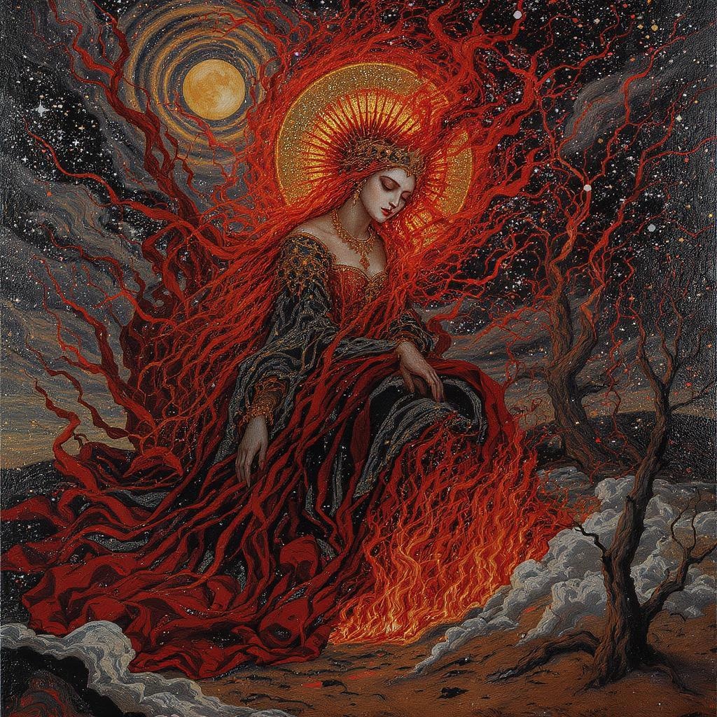 A dreamscape in a dystopian world, painted in an impressionist style with pointillism techniques, depicting a dramatic gothic portrait of a queen suffering for her kingdom, consumed by flames. The piece embodies classic religious baroque art, enveloped in darkness, mystery, and unsettling drama. Meticulously composed of vibrant and detailed dots, the artwork showcases medieval influences with brilliant surfaces and textures. Loose brushstrokes play with vibrant colors and light and shadow contrasts to capture emotion over form. It presents a desolate, post-apocalyptic vision, both somber and intricately detailed. The scene is surreal, ethereal, dreamlike, mysterious, and fantastical, retaining its highly detailed nature throughout.