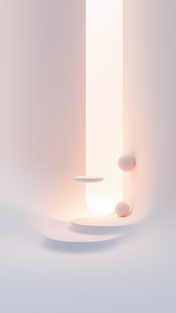A dreamscape of minimalist forms, where ordinary objects defy logic and float in a serene vertical expanse, bathed in ethereal light and gentle curves, evoking a peaceful yet mind-bending simplicity.