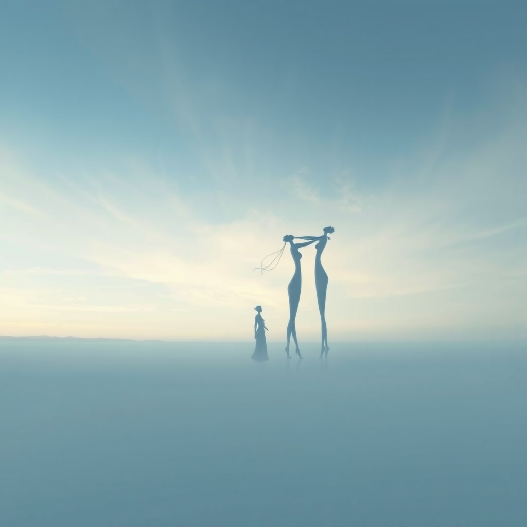 A dreamscape of minimalist surrealism unfolds; tall, slender figures gently intertwine within a vast, ethereal landscape, their forms blending seamlessly with the horizon under a dreamlike sky, softly distorted yet elegantly simple, a harmonious dance of intricate subtleties.