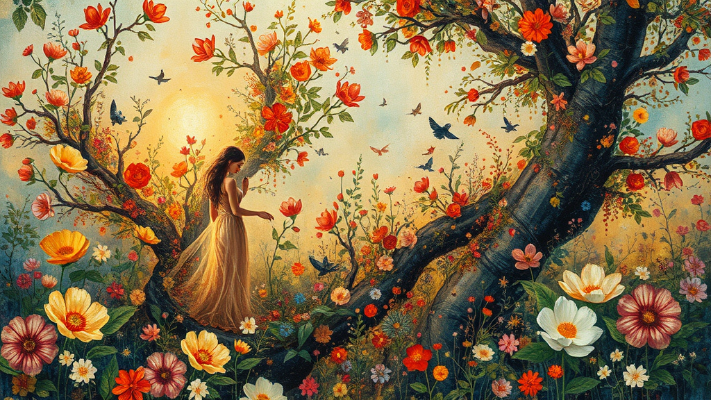 A dreamy and intricate scene inspired by the enchanting styles of Gustav Klimt, Nicoletta Ceccoli, Catrin Welz-Stein, Dee Nickerson, and Luis Royo, infused with the vibrant and fluid beauty of alcohol ink techniques. This masterpiece captures the delicate grace of figures intertwined with lush, flourishing nature, bathed in a brilliant play of color and light reminiscent of Pierre-Auguste Renoir's impressionistic touch. Soft, ethereal elements intertwine with bold patterns and textures, creating a mystical landscape that blends reality with fantasy.