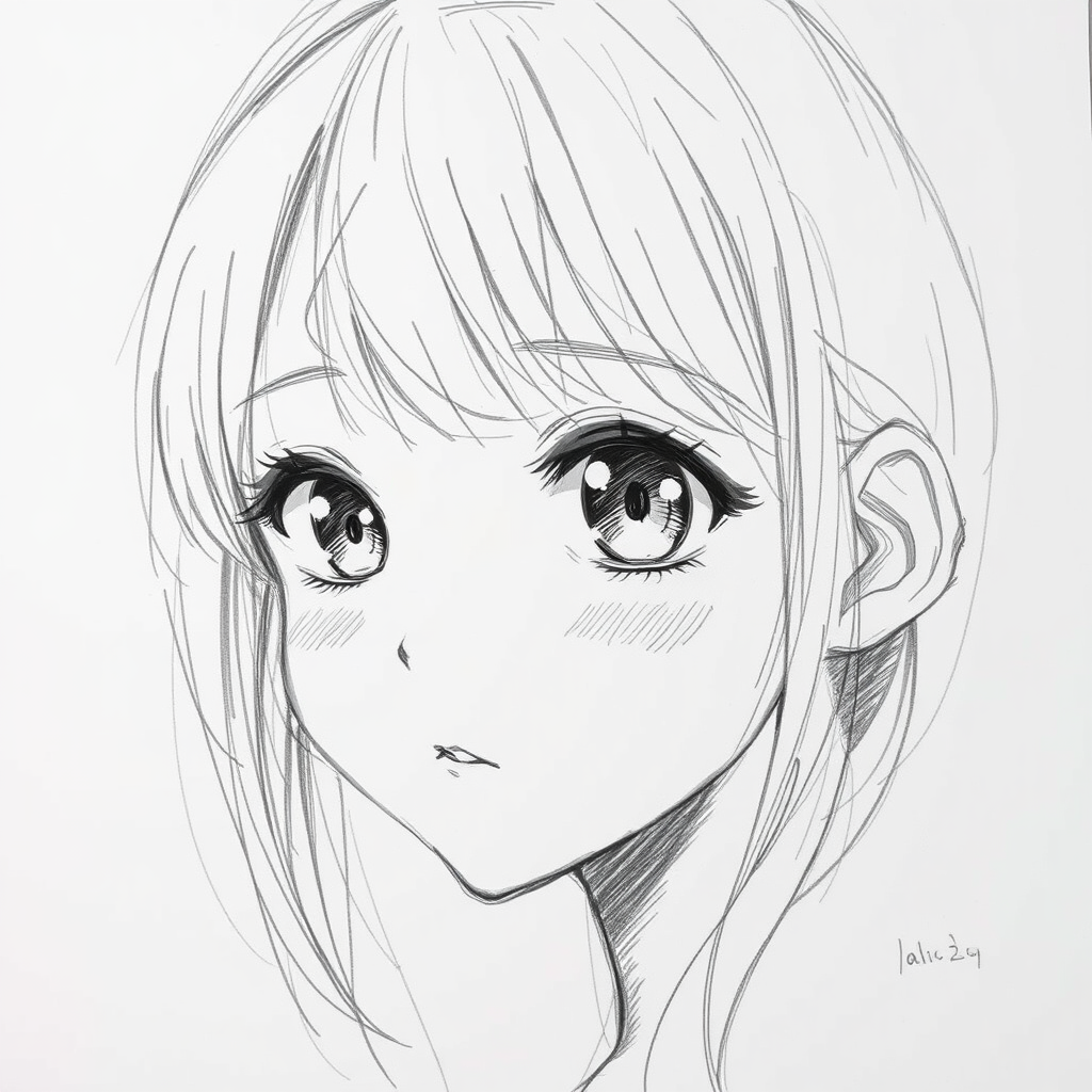 A dreamy anime-inspired sketch of a female face featuring expressive eyes, combining the artistic styles of the Pont-Aven and Barbizon schools. The piece showcases masterful and heavy shading techniques, with an emphasis on texture exploration. It captures a cute and ethereal essence, evoking a whimsical and enchanting mood.