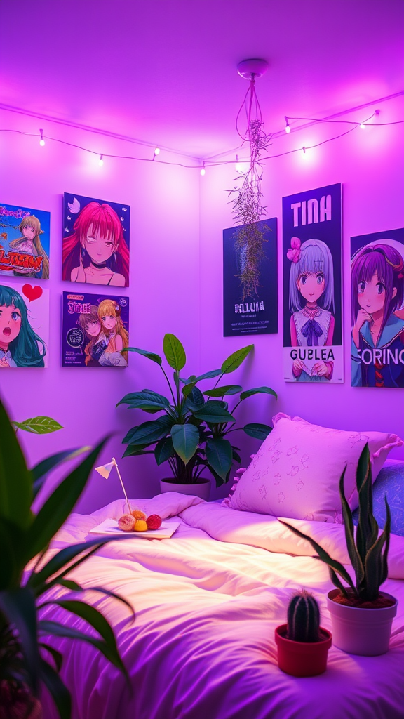 A dreamy bedroom bathed in soft purple lights, where vibrant anime posters adorn the walls. Lush green plants and adorable cactus pots add a touch of nature. The space feels magical and cozy, blending a whimsical atmosphere with a sense of tranquility.