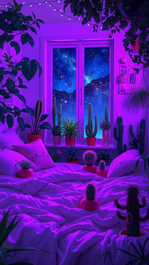 A dreamy bedroom filled with lush greenery and cute cactus arrangements, bathed in the soft glow of purple lights. The walls are adorned with anime-inspired art, creating a whimsical and cozy atmosphere. Plush pillows and blankets add to the comfort, while the night sky peeks through a window, accented by twinkling fairy lights. The space feels serene and charming, a perfect blend of nature and imagination.