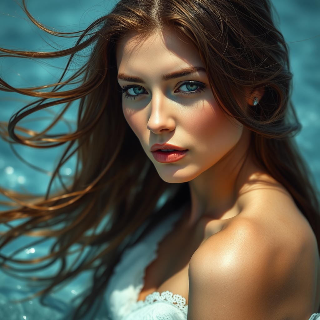 A dreamy close-up of a woman with long, flowing hair caught in the wind, captured in a style reminiscent of pop inspiration and Mario Testino. Her expression is soft and captivating, set against a backdrop of hyper-realistic water that shimmers and moves like animated gifs. The color palette blends sky-blue and earthy brown tones, adding a serene and ethereal quality to the image.