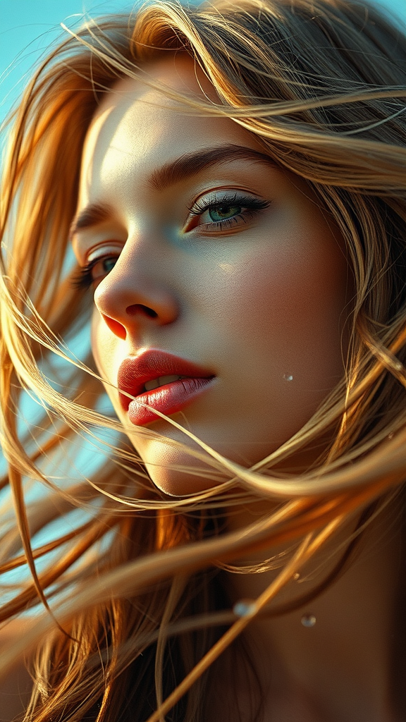 A dreamy, close-up portrait of a woman with long, flowing hair being swept up by the wind, against a backdrop inspired by pop art. Her expression is soft and ethereal, reminiscent of Mario Testino's fashion photography, with hyper-realistic water droplets adding texture to the image. The color palette combines sky-blue and rich brown hues, creating a harmonious, emotive feel. The scene also features subtle, animated elements that give the image a dynamic, gif-like quality, blending realism with a touch of surreal animation.