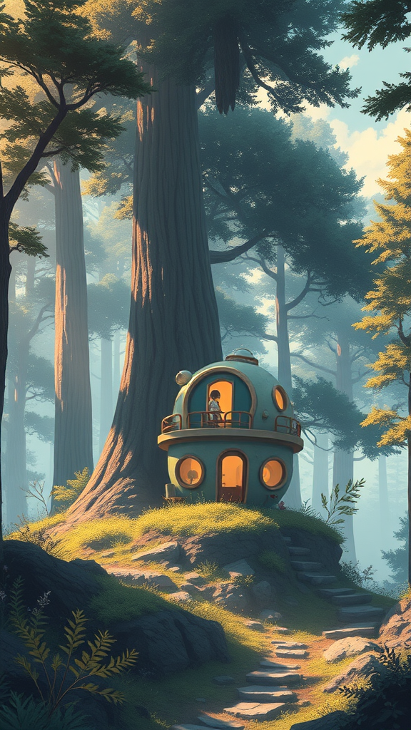 A dreamy futuristic landscape in a digital 2D style reminiscent of Miyazaki, showcasing a magical and intricate wilderness with the tiniest details. A small, endearing girl lives independently amidst the awe-inspiring vastness of nature. Her quaint, futuristic home is a multilayered, rounded structure nestled among towering trees. This delicate habitation cabin is intricately designed, blending seamlessly with its environment. The scene is bathed in dramatic, soft lighting that enhances the enchanting atmosphere, adhering to the rule of thirds for a cinematic composition. Luxuriant foliage and whimsical elements abound, creating a captivating sci-fi world that is both fantastical and serene.