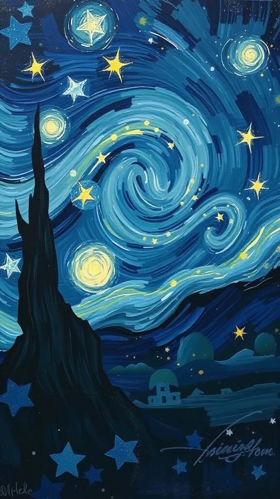 A dreamy landscape of swirling stars and soft brush strokes, capturing a whimsical night sky reminiscent of Van Gogh's Starry Night. The scene evokes a deep sense of melancholy, where each stroke radiates a gentle glow against the velvety darkness. The stars twirl in a dance of light, enhancing the painting's emotive charm with a raw and expressive style.