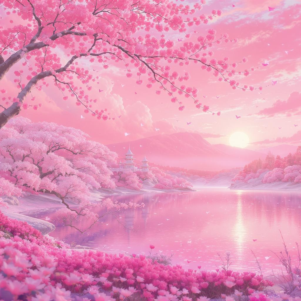 A dreamy pink landscape unfolds, saturated with perfect pink shading that cascades over every detail. The scene is illuminated by a soft, pink atmospheric glow, reminiscent of the enchanting style of Makoto Shinkai. The environment captures the essence of ethereal beauty, blending the soft lines and vivid imagination of Stanley Artgerm Lau, the fantastical elements of WLOP, and the vibrant flair of Ross Draws. The sky blushes with gentle hues, while delicate cherry blossoms drift lazily on the warm, rose-tinted breeze. Pink-hued clouds float above a serene, shimmering lake, which reflects the soft luminescence of a surreal sunset. In the distance, elegant silhouettes of delicate structures rise, their forms absorbed by the pink glow that unifies the scene into a harmonious blend of art and imagination. Subtle variations in the shades of pink add depth and warmth, inviting viewers into a world where everything is gently kissed by the magic of pink.
