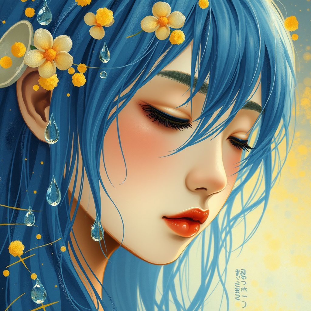 A dreamy portrait of a girl with blue hair, her eyes gently closed, captured in the vibrant style of the stars art group. She is adorned with a cascade of water drops. The scene is imbued with romantic hues of yellow and orange, blending with intense lines reminiscent of gongbi technique, softened by loose paint application. The artwork radiates an ethereal charm and celestial aesthetic, embodying a serene yet dynamic presence.