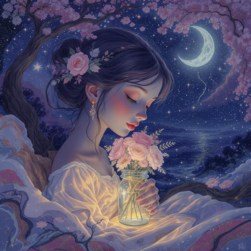 A dreamy portrait of a girl with flowers in a jar, set in an enchanting nocturnal scene. Her face, slightly smudged, adds a touch of realism amidst the fantasy. The background is a tapestry of glowing colors, seamlessly blending into a multidimensional landscape. Her ears are adorned with delicate wire earrings, subtly catching the moonlight. The storybook illustration style comes to life with intricate details, capturing the essence of a mystical dreamscape. Her expression is one of quiet wonder, eyes reflecting the mysterious ambiance around her. The scene is both detailed and imaginative, with hints of gentle magic woven into every element. Everything is framed in a soft, ethereal blur, enhancing the otherworldly feel while maintaining a sense of clarity on her captivating features.