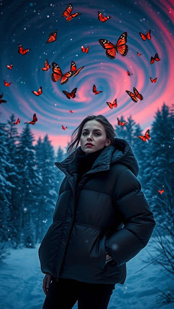 A dreamy scene of a snowy winter fashion showcase featuring puffer jackets, set against a surreal night sky swirling with dynamic hues of red and blue. The air is alive with realistic butterflies, their gentle glow illuminating the dark forest surroundings. The atmosphere is imbued with minimalist beauty and an androgynous allure, with a light black, cold palette capturing a cosmopolitan essence. Serene faces are highlighted amidst the loose, fluid movements, creating ethereal abstractions in a harmonious yet chaotic dance, blending tranquility with vibrant energy.
