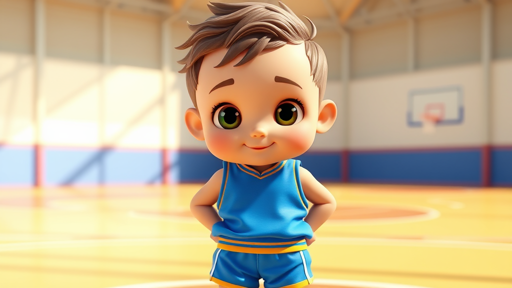 A dreamy, super cute sports boy stands on a clean, bright basketball court background. He wears a basketball vest and vibrant blue shorts, his big, watery eyes radiating excitement and charm. The scene captures him in a Disney-inspired, high-detail 3D render, emphasizing ultra-refined features. His face is illuminated with bright, frontlighting, showcasing a fine luster and rich, vivid colors. The design resembles a pop art collectible or blind box toy, rendered in hyper-quality 8k resolution. The boy's youthful exuberance and playful energy are encapsulated in a captivating shot, with intricate details and a glossy finish enhancing the overall enchantment.