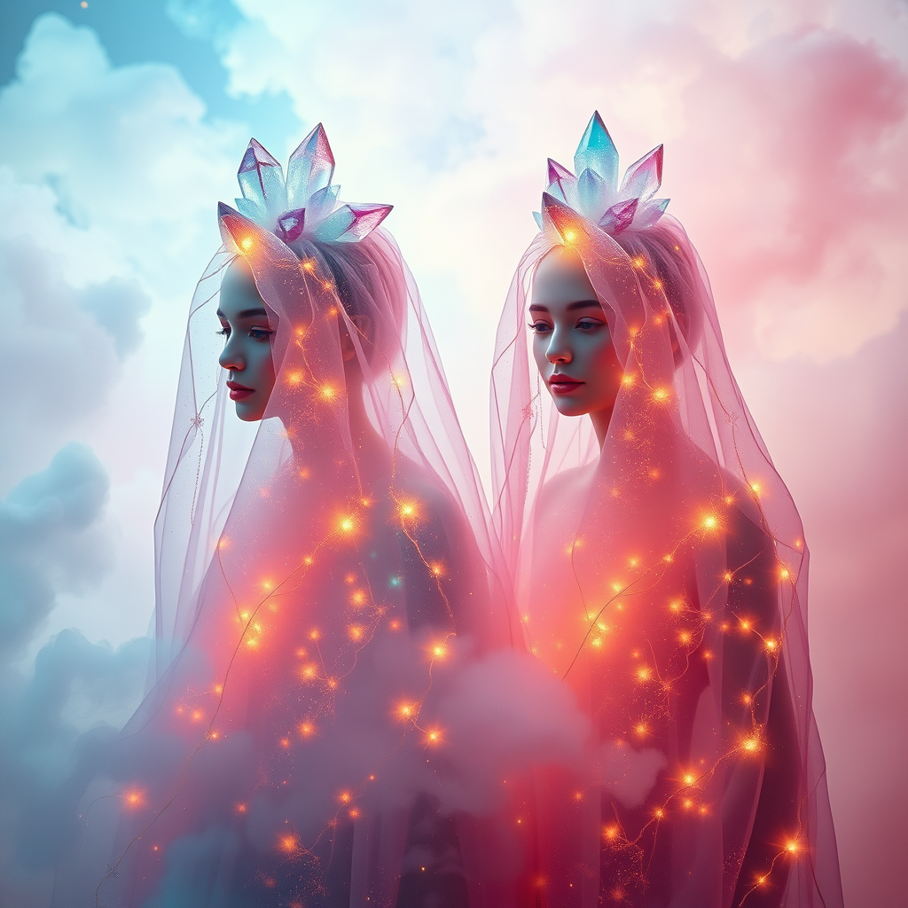 A dreamy swirl of colorful smog envelops ethereal figures draped in twinkling lights, their heads adorned with delicate crystals. Rendered in pastel colors and abstract styles, these mystical beings exude an elusive beauty that merges surrealism with emotional depth. Captured in 32k UHD resolution, the scene showcases perfect anatomical form with professional, cinematic photography. The figures stand in stillness, their expressions full of imagination and wonder, while a cinematic angle and dramatic lighting enhance the otherworldly atmosphere. This masterpiece of official art presents a whole-body cowboy shot from afar, inviting viewers into its imaginative realm, free of imperfections or distractions.