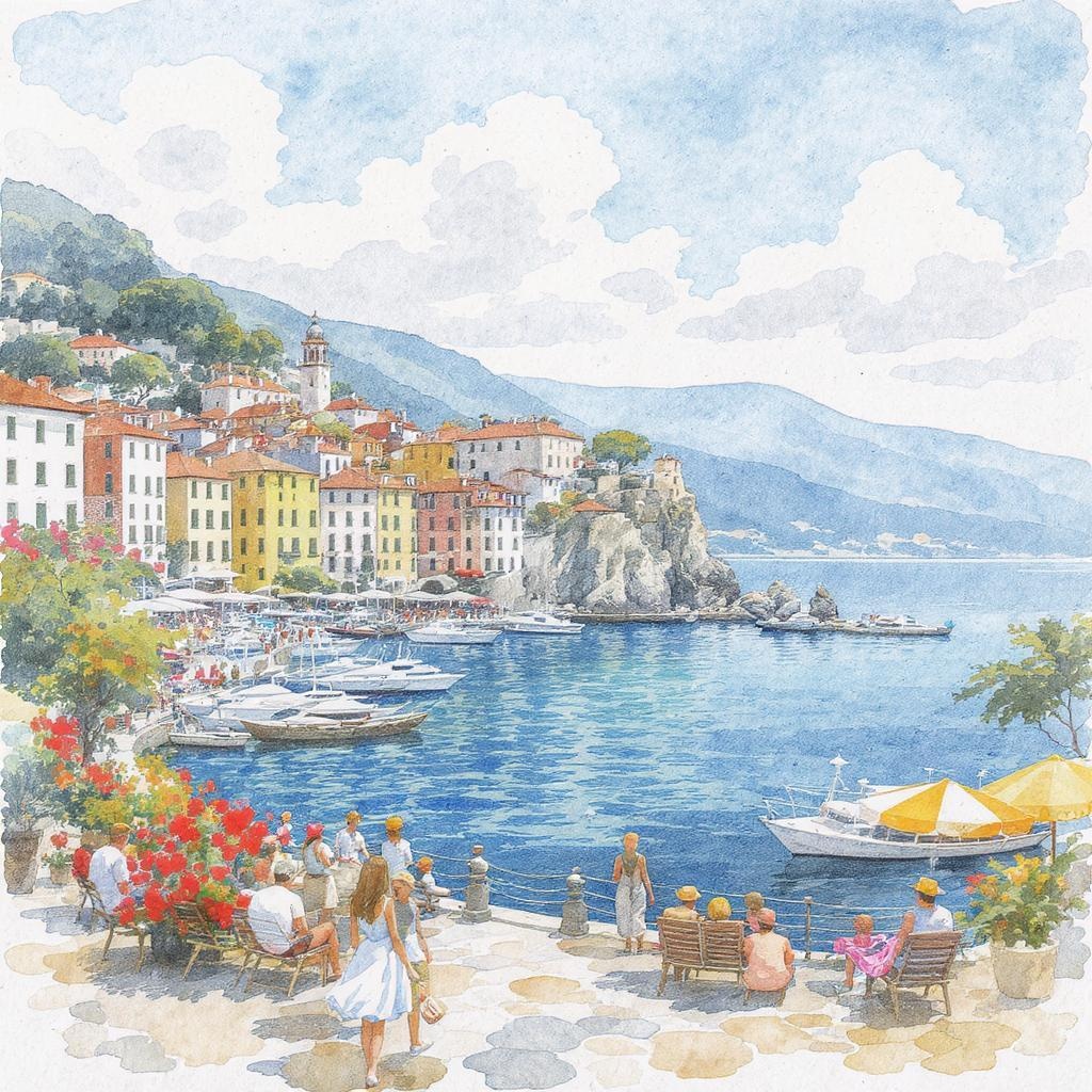 A dreamy watercolor depiction capturing a wide-angle view of Riva del Garda, an idyllic Mediterranean harbor scene. The painting exudes bright colors and intricate details, rendered on a wet paper texture. This masterful yet understated composition plays with soft lighting to highlight the bustling atmosphere of people enjoying their day, despite some quirky touches of bad anatomy. The overall effect is both richly detailed and subtly charming, contrasting elements of sharpness with low resolution to evoke a nostalgic, low-quality feel that enhances its artistic allure.