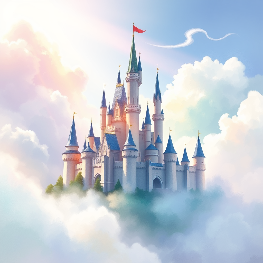 A dreamy watercolor painting of a majestic castle nestled in the clouds, with towers and spires reaching toward the heavens. The scene is bathed in a soft, pastel color palette, featuring gentle hues of lavender, mint green, and pale peach. Wispy clouds float around the fortress, creating an ethereal and serene atmosphere. Sunlight filters through, casting a magical glow and highlighting the delicate architecture with shimmering reflections. The castle seems both grand and weightless, as if it could drift away on the next breeze.