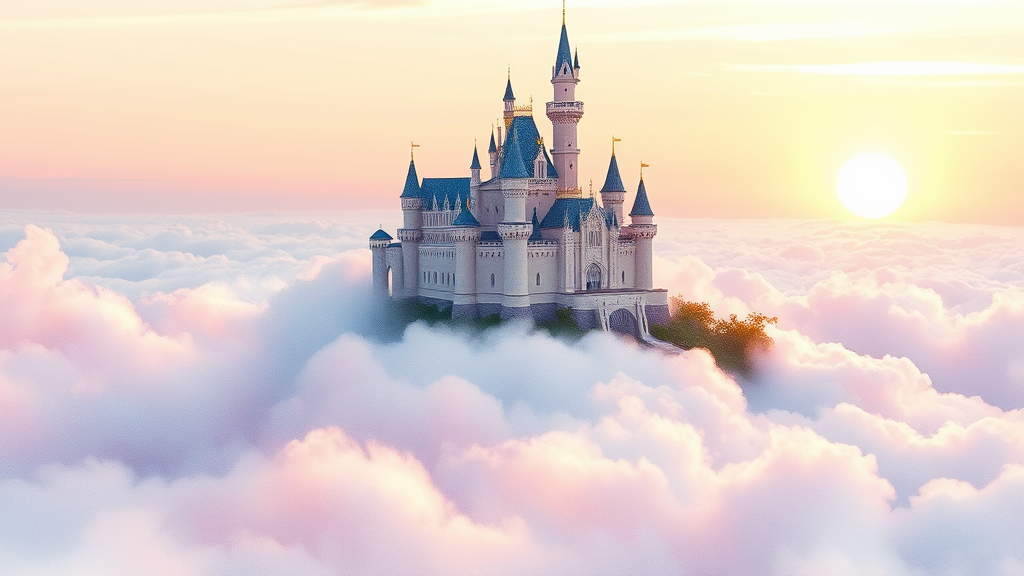 A dreamy watercolor scene depicting an expansive castle perched atop fluffy clouds, painted in soothing pastel hues. The castle's towers spiral gracefully into the sky, their tips adorned with delicate gold accents that shimmer subtly in the soft light. Below, gentle swirls of pink, lavender, and baby blue clouds cradle the castle, creating an ethereal floating effect. Wisps of mist curl around the turrets, enhancing the otherworldly atmosphere. The scene is bathed in a serene glow from a sun setting on the horizon, casting a warm, peachy luminescence across the sky, blending seamlessly into the tranquil backdrop.