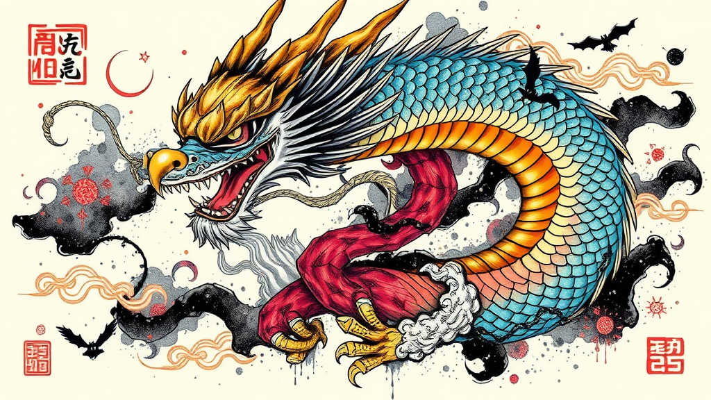 A dynamic 3/4 view of a Chinese-style dragon intertwining with cyberpunk elements, featuring intricate ink textures and a striking metallic gold leaf head. The composition embodies the edgy, animated essence of Gorillaz and the energetic flair of FLCL, while embracing the bold, linear aesthetic reminiscent of Yoji Shinkawa's work. The dragon's sinuous form is accentuated with vibrant, pulsating colors, blending tradition with futuristic nuances, creating a vivid tapestry that's both timeless and avant-garde.