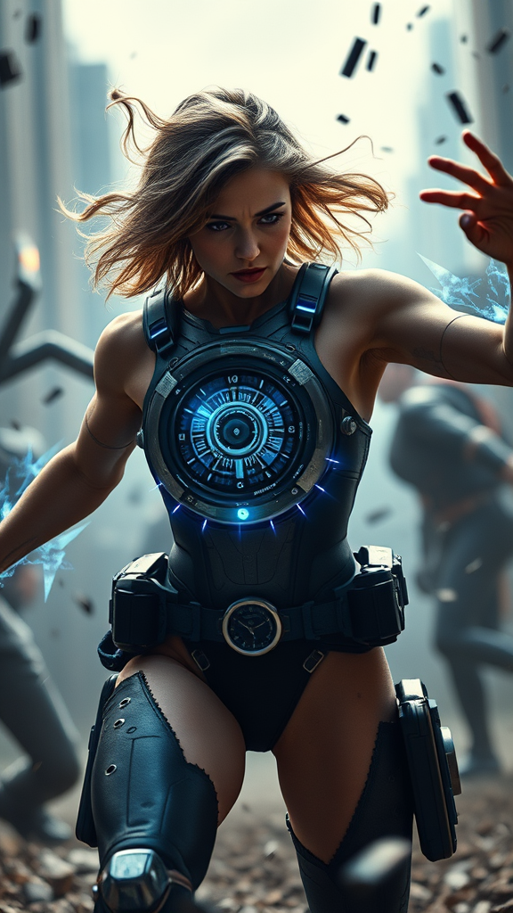 A dynamic action scene with a British hero who manipulates time, captured in dramatic, full-length, realistic photography. The hero, equipped with her Chronal Accelerator, a central circular device on her chest, showcases intricate circuitry and a pulsating blue energy. This empowers her with the ability to blink through space, recall past actions, and manipulate the flow of time itself. In the heat of action, the scene is depicted with a poorly drawn anatomy and blurry limbs, adding a surreal, chaotic energy as she traverses time and battles her foes.