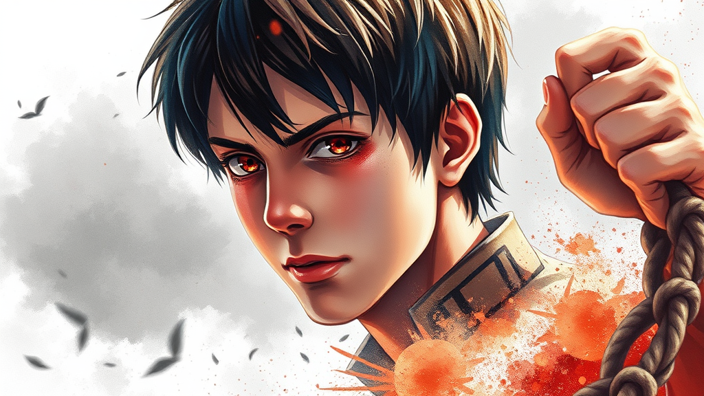 A dynamic and highly detailed digital illustration of Eren Jaeger from Attack on Titan, embodying a cinematic feel with an emphasis on entrapment and connection, as if tied to the horizon. Rendered in vibrant watercolor style, this artwork captures perfect anatomy and an approaching perfection, with Eren centered in the composition. The piece is inspired by concept art and is imagined in a fictional world where the characters have slightly different features: Eren has red eyes and textured brown hair, blending elements of different ethnic backgrounds. The backdrop is monochrome to enhance the vividness of Eren, creating a striking contrast. Although vibrant and bold, the artwork maintains a touch of the surreal, avoiding cartoonish depictions while embracing a mix of Asian and African influences, resulting in a unique portrayal where small creative modifications enhance the original concept.