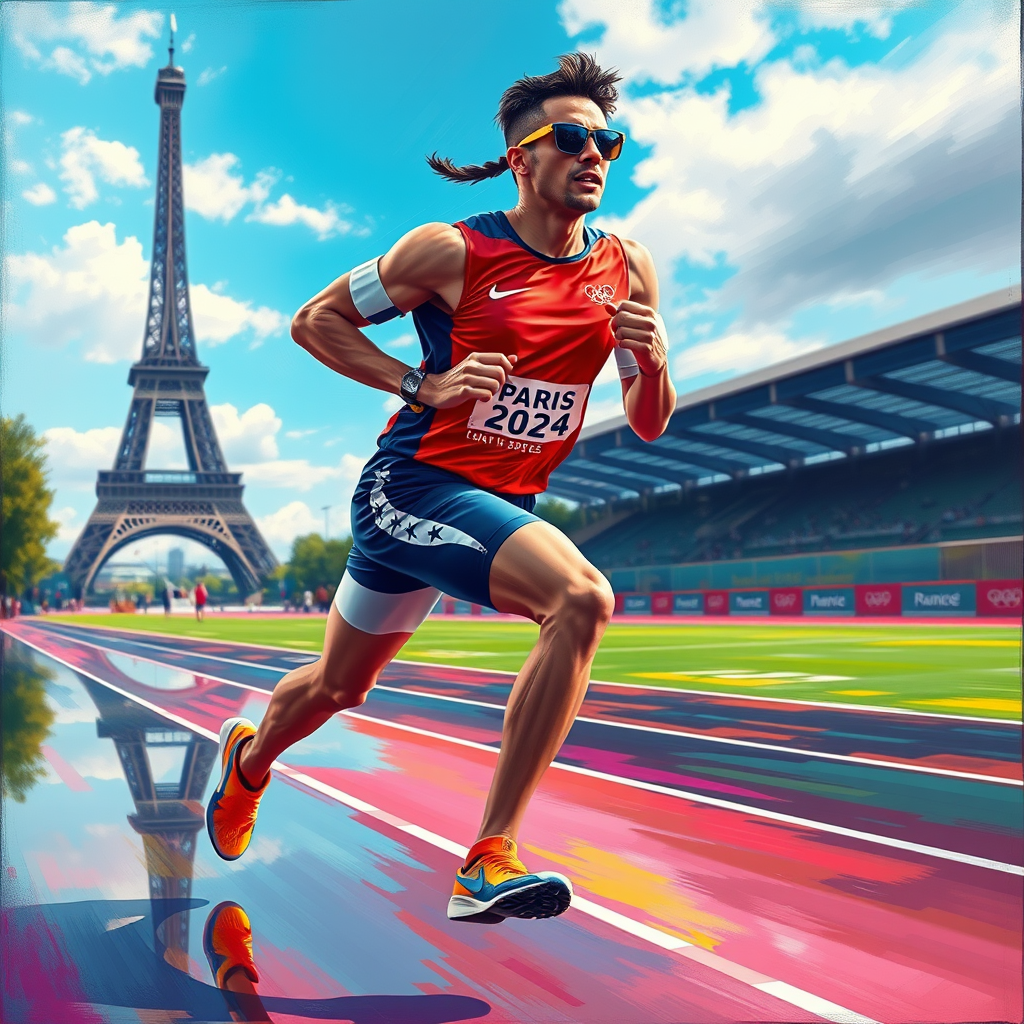 A dynamic and intricate airbrushed painting of an Olympic athlete mid-stride, inspired by Greg Rutkowski's style. The runner is clad in eye-catching, colorful gear, the Paris Tower majestically rising in the background. He sprints along a kaleidoscopic track, reflecting vivid hues beneath him. Wearing sleek sunglasses and the official France Olympic outfit, "Paris - 2024" is emblazoned elegantly on his arm. In the scene, a gentle breeze adds movement to the runner's attire, accentuating the energy and vitality of the moment.