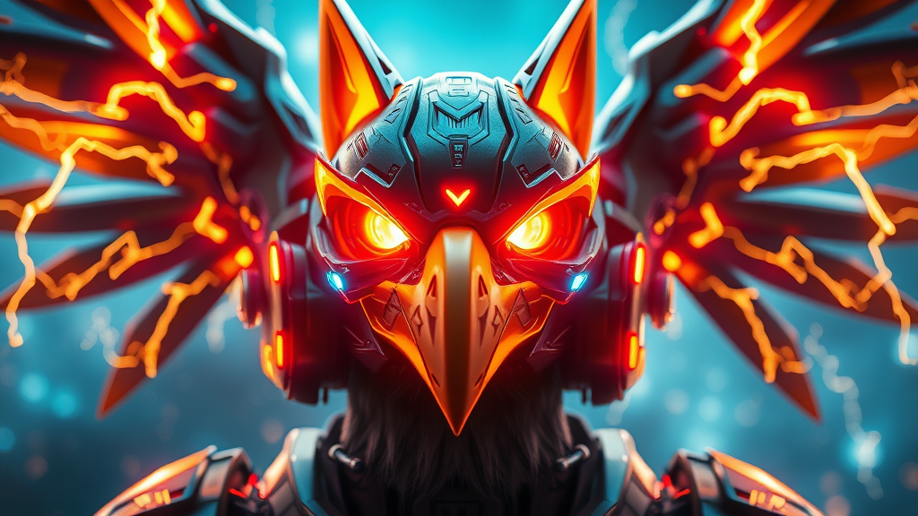A dynamic and vividly detailed headshot of a gay male protogen fursona, portrayed as an intricately crafted thunderbird with striking lightning wings. The scene is infused with a cyberpunk aesthetic, featuring dramatic and cinematic lighting that emphasizes glow effects across the mecha-enhanced features. The sharp focus highlights the mecha elements and bokeh effect, set against a mesmerizing Sci-Fi background. The image is rendered in rich, vivid colors, optimized for 16k UHD with HDR10, showcasing absurd resolution for a breathtaking visual experience. The overall composition pays homage to the model Lyriel v. 1.5 with slight creative twists to maintain uniqueness.