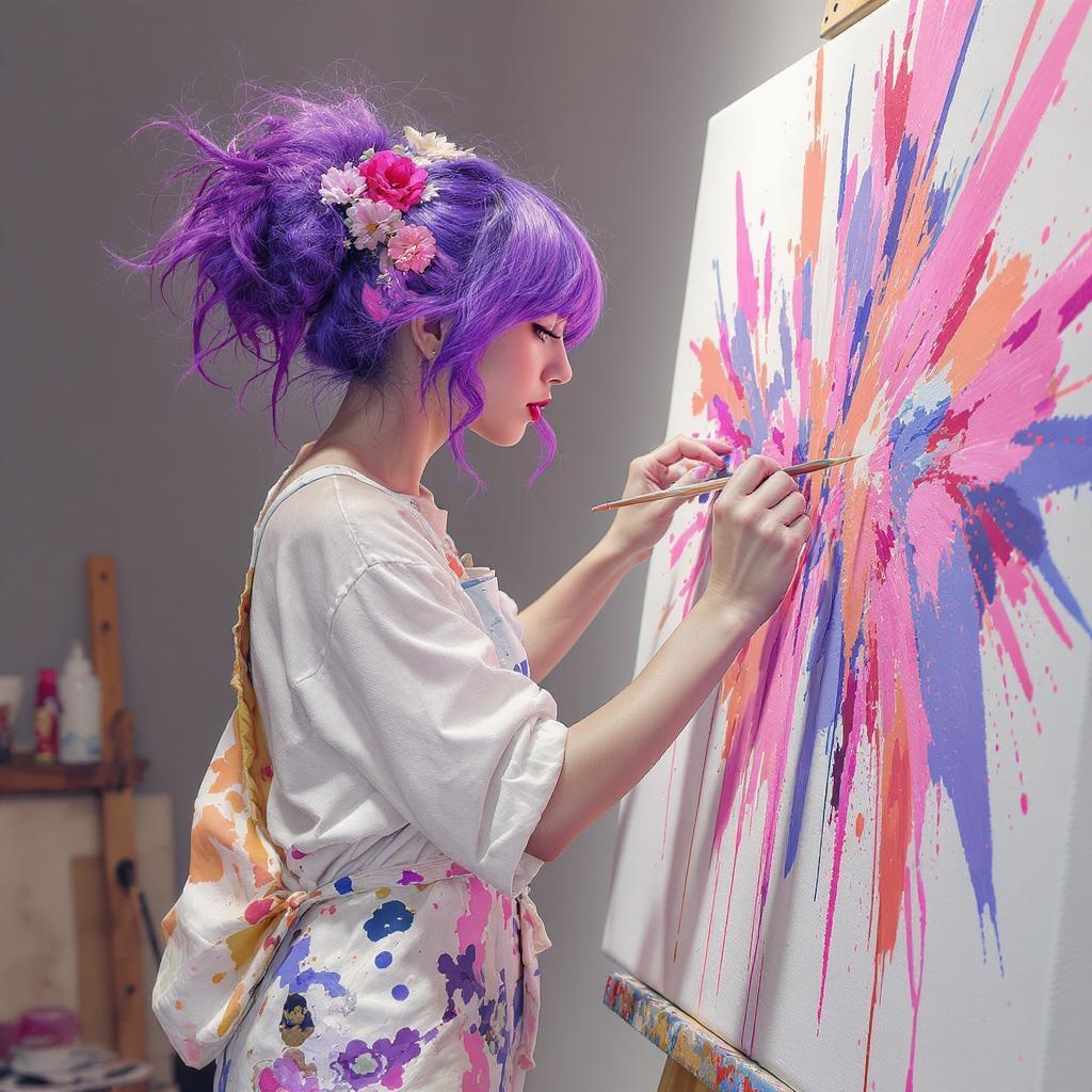 A dynamic artist passionately crafting an abstract masterpiece, their colorful hair reflecting the hues of their creation, reminiscent of Kazuo Oga's style, interspersed with polka dots and flourishing flowers in shades of purple and pink. The scene captures an exuberant blend of artistic influence, presented in a high-definition, ultra-detailed focus, presenting a vibrant explosion of color and creativity.