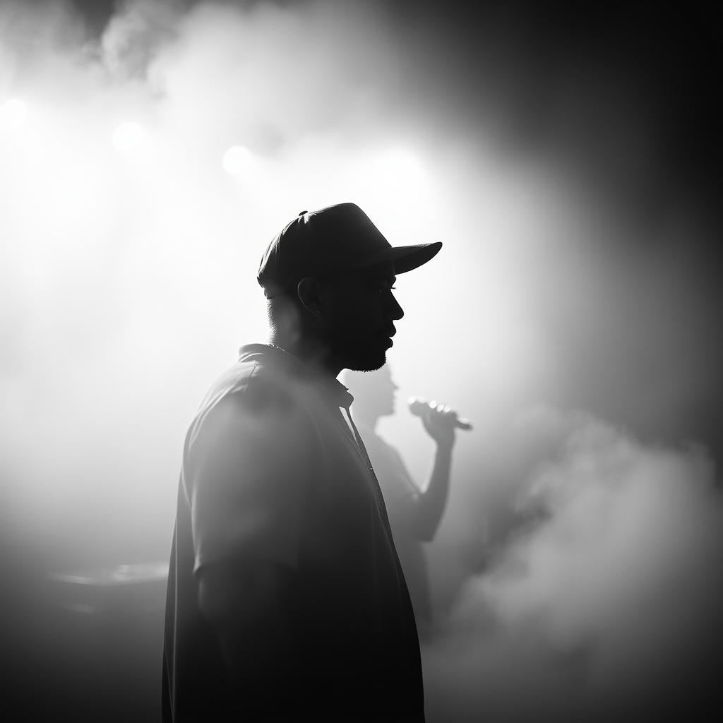 A dynamic black and white photograph captures a rapper in a baseball cap silhouetted against a misty haze as he emerges from the fog on stage during a concert. The image is taken from a side view, with dramatic volumetric lighting casting rays through the fog, creating a striking cinematic effect. The scene is rendered with a unique angle that emphasizes the energy and movement of the performance, highlighting the contrast between the sharp details of the performer and the ethereal quality of the surrounding mist.