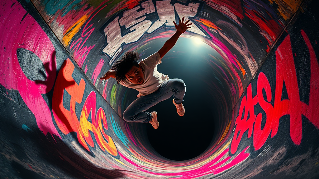 A dynamic breakdancer soars through an intriguing, vibrant spray-painted graffiti blackhole, their perfect eyes capturing the viewer's attention. The scene is a cinematic masterpiece with dramatic lighting reminiscent of a classical oil painting by Yoshitoshi. The colors swirl and blend, creating an otherworldly spectacle. The entire atmosphere speaks of mystery and artistry, as if captured in a grand timeless painting, with the surreal elements of a fantastical graffiti world enveloping the dancer.