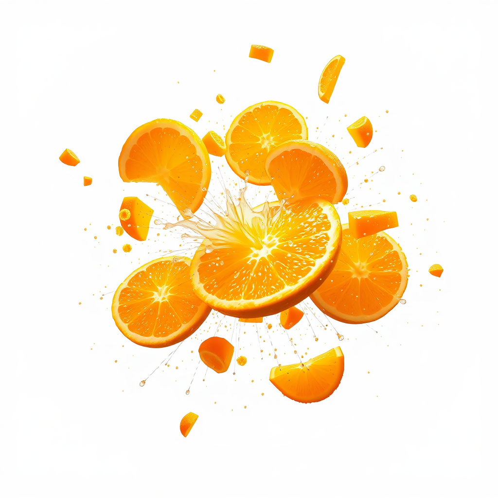 A dynamic burst of bright orange segments, intricately detailed and seemingly suspended in mid-air against a crisp, pristine white backdrop. Each piece of the orange is meticulously rendered, with vibrant textures and a slightly surreal twist. The juicy segments appear to be in motion, as if captured mid-explosion, creating a sense of energy and movement. Specks of zest and droplets of juice are scattered around, adding a playful complexity to the scene. The white background enhances the contrast, making the vivid oranges leap off the imaginary canvas.