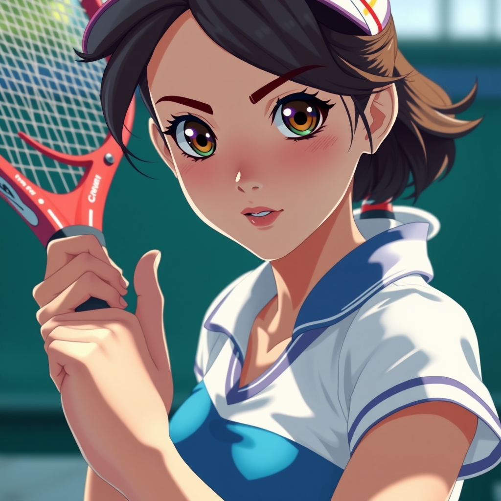 A dynamic close-up of a young woman in a vintage tennis outfit, her retro anime aesthetics reminiscent of Misty from Pokémon, embodying the vibrant 1980s and 1990s anime art style. Her expression is determined as she grips a tennis racket with confidence, capturing the essence of a nostalgic yet timeless retro anime heroine. The scene is rendered in a realistic 3D anime style, emphasizing the vivid colors and intricate details typical of classic 1980s anime, giving her an iconic and energetic presence.