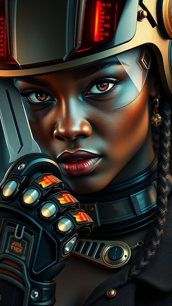A dynamic close-up portrait of a stylish African cyberpunk woman embodying afrofuturism, her intense gaze peering through a visor that glows with neon data streams. She holds a sleek knife in one hand, clad in a high-tech glove designed for precision. Her attire blends intricate steampunk elements with modern cybernetic enhancements, a testament to her dual identity as a mechanoid alchemist. Her silhouette is adorned with biomechanical jewelry, and locks of braided hair escape beneath a sleek, futuristic helmet reminiscent of Loba Andrade's battle-ready elegance. Her skin shimmers with the subtle hue of polished obsidian, paying homage to Ororo Munroe's regal fierceness. In this vibrant world where cybernetic merchants trade in dreams and technology, she stands poised, a trailblazing teen cyborg at the forefront of a narrative where past and future intertwine.
