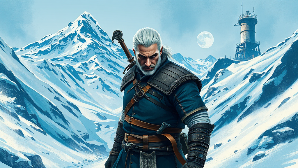 A dynamic depiction of a Witcher figure standing amidst mountainous vistas, rendered in an expressive brushwork style with a palette of light blue and indigo. The scene captures the stark beauty of snow-laden landscapes and introduces a hint of industrial elements in the background. The composition focuses on the Witcher with intricate close-up details, emphasizing his rugged features and gear. An aura of mystery and adventure envelops the scene, enhanced by the play of light and shadow characteristic of a vivid, storytelling painting.